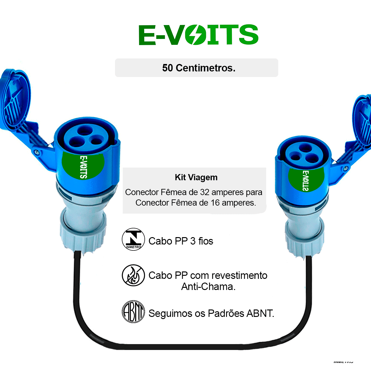 • Para Adaptadores de 5 e 10 mts: Cabo PP de 3 fios 4,0mm (16a) e 6,00mm (32a) com revestimento Anti-Chama.